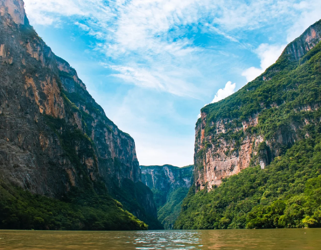 Cañón del Sumidero en lancha, falaises, crocodiles, nature exubérante.