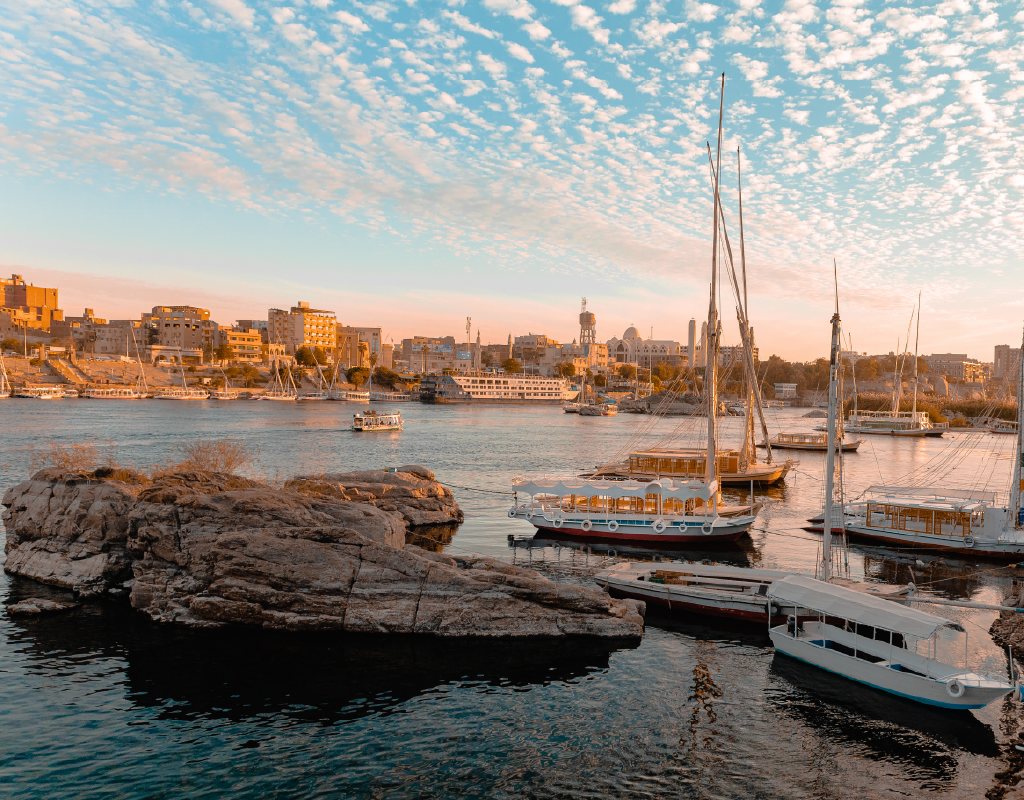 Vol pour Assouan, carrefour du Sud et ville de contraste entre granits, îlots et rives calmes du Nil.
