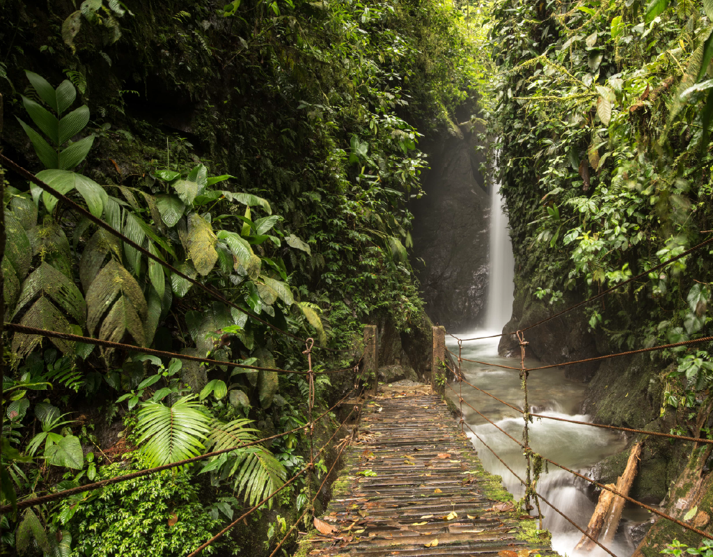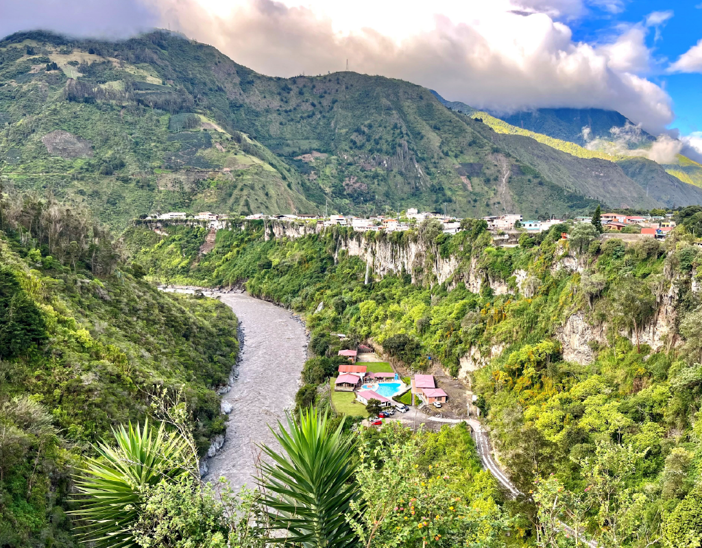 Vous faites halte aux célèbres chutes du Pailón del Diablo, parmi les plus spectaculaires du pays. Une passerelle permet d’approcher la cascade et d’observer ses trois puissants torrents. Un peu plus loin, une nacelle suspendue — la tarabita— vous transporte au-dessus des gorges vers la cascade du Manto de la Novia.